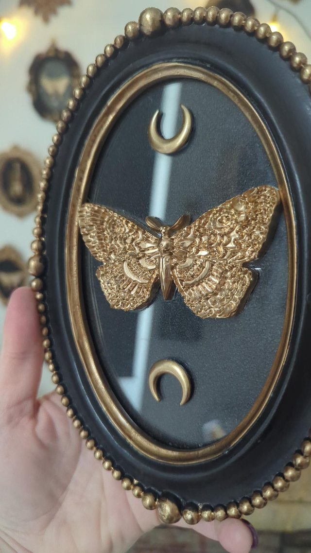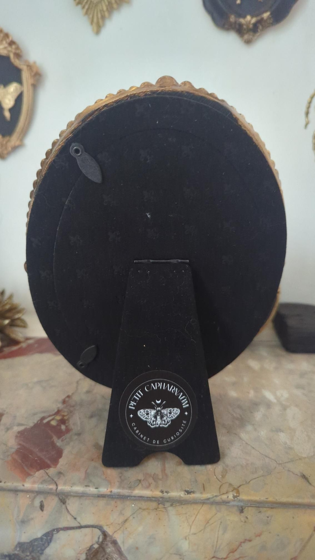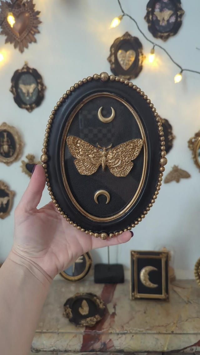 🌙 Ce cadre ovale noir et doré dévoile un papillon finement sculpté, encadré par deux croissants de lune, formant une composition d’une mystique harmonie. Évoquant à la fois la nuit, la métamorphose et la lumière intérieure, cette œuvre réunit les symboles du cycle de la vie et de la beauté éphémère.